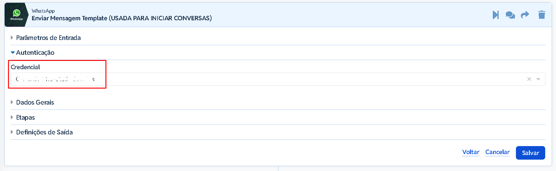 Antes de tudo, confirme se a credencial de WhatsApp está corretamente inserida e associada ao robô desejado.