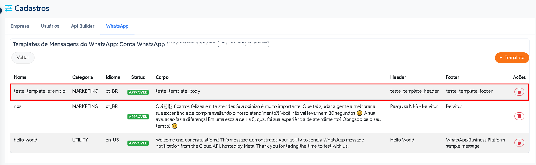 O uso de templates é obrigatório para o envio de mensagens via WhatsApp e está sujeito às regras da própria plataforma WhatsApp.