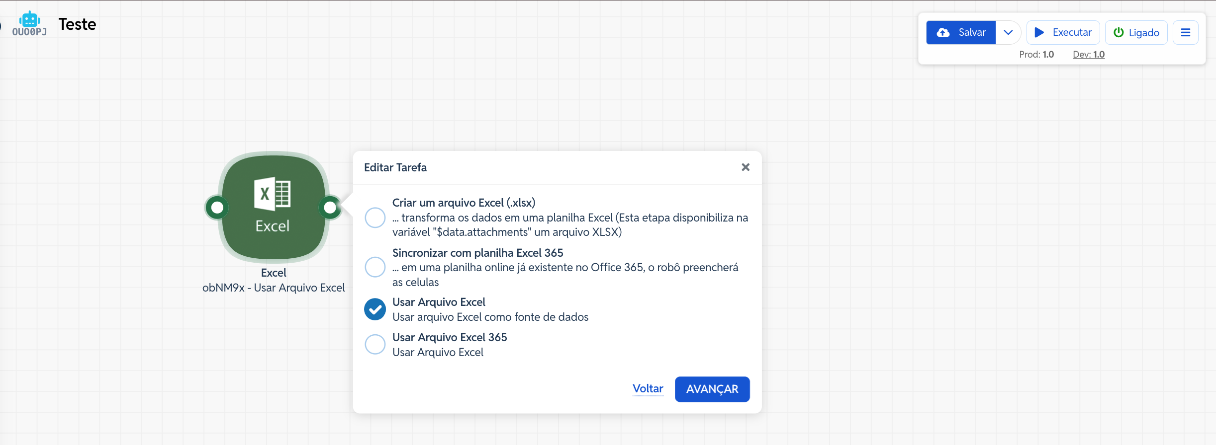 Selecione a ação Usar Arquivo Excel