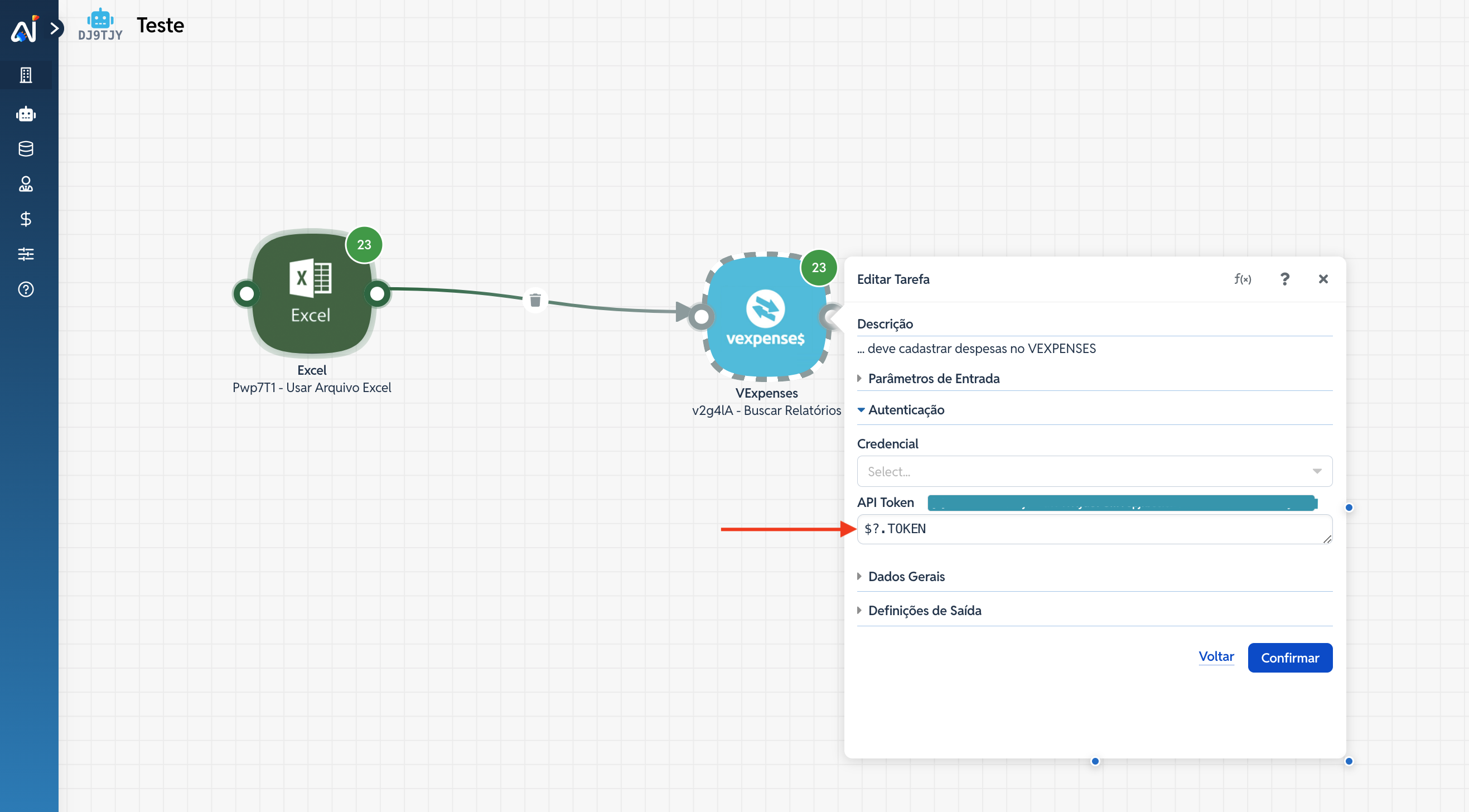 Agora, configure o conector que necessita de autenticação via token (ex.: VExpenses, APIs REST, conectores externos).