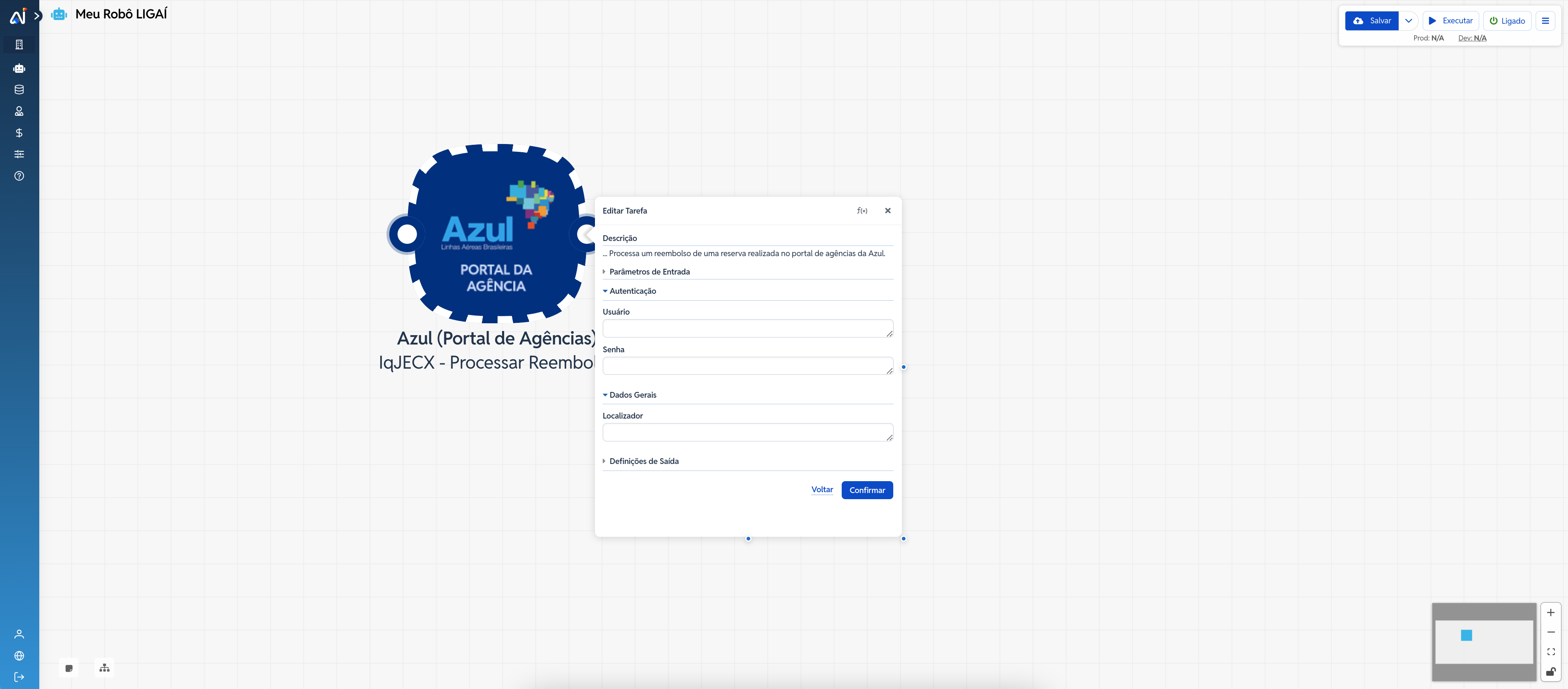 Este artigo explica como configurar o conector Azul (Portal de Agências), na ação Processar Reembolso, dentro de um robô no Ligaí. Essa ação permite processar o reembolso de uma reserva realizada diretamente no portal de agências da Azul.