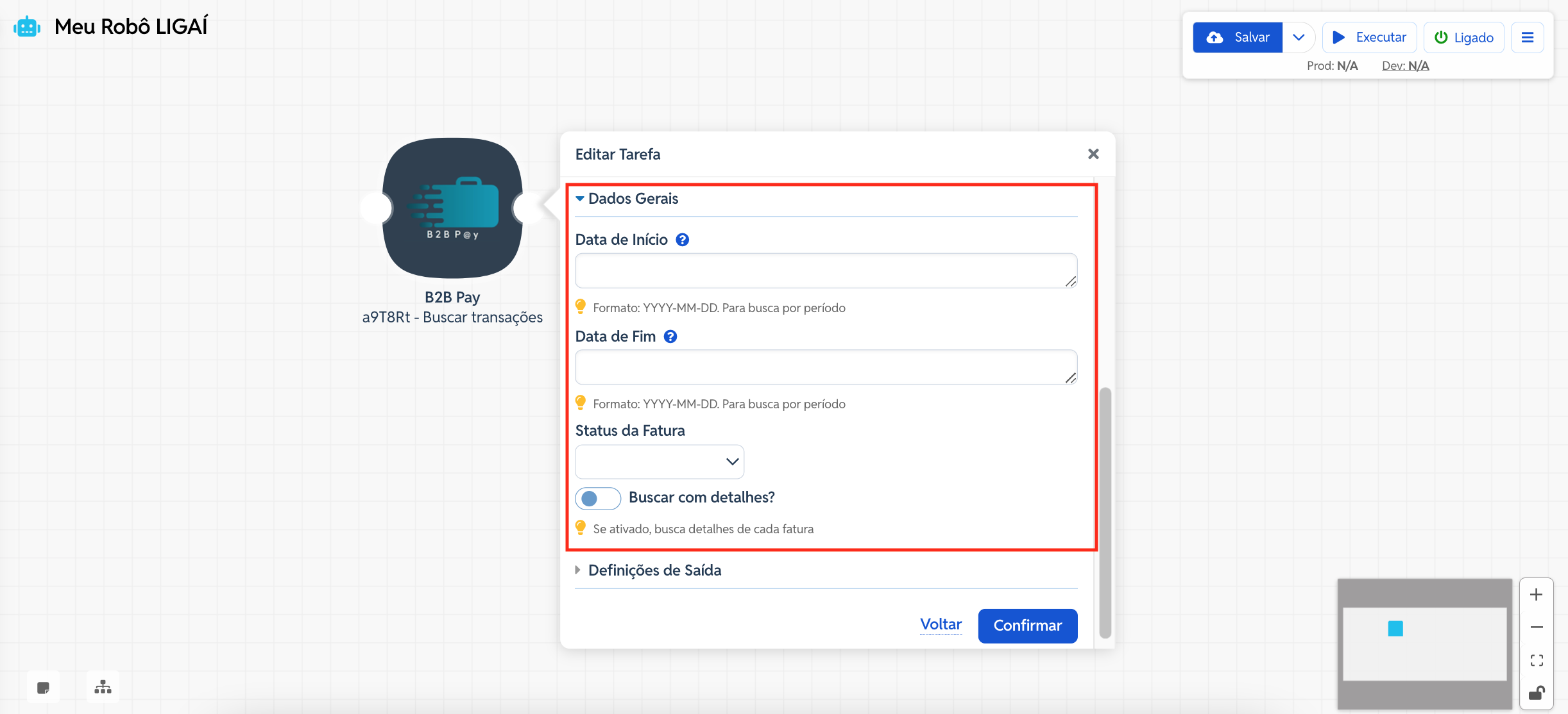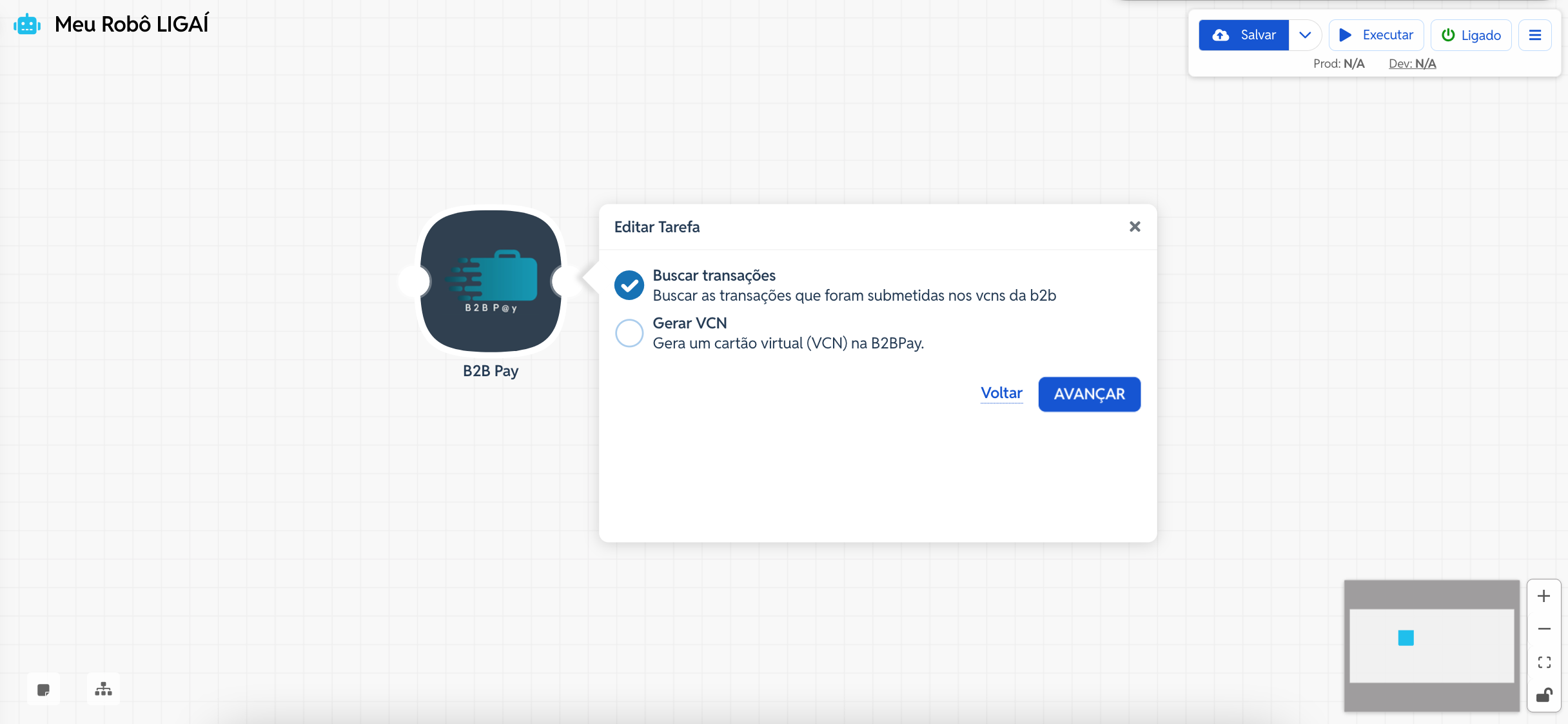 Este artigo explica como configurar o conector B2B Pay, na ação Buscar Transações, dentro de um robô no LIGAí. Essa etapa tem como objetivo recuperar o histórico e os detalhes das transações que foram submetidas nos Cartões Virtuais (VCNs) da B2B Pay.