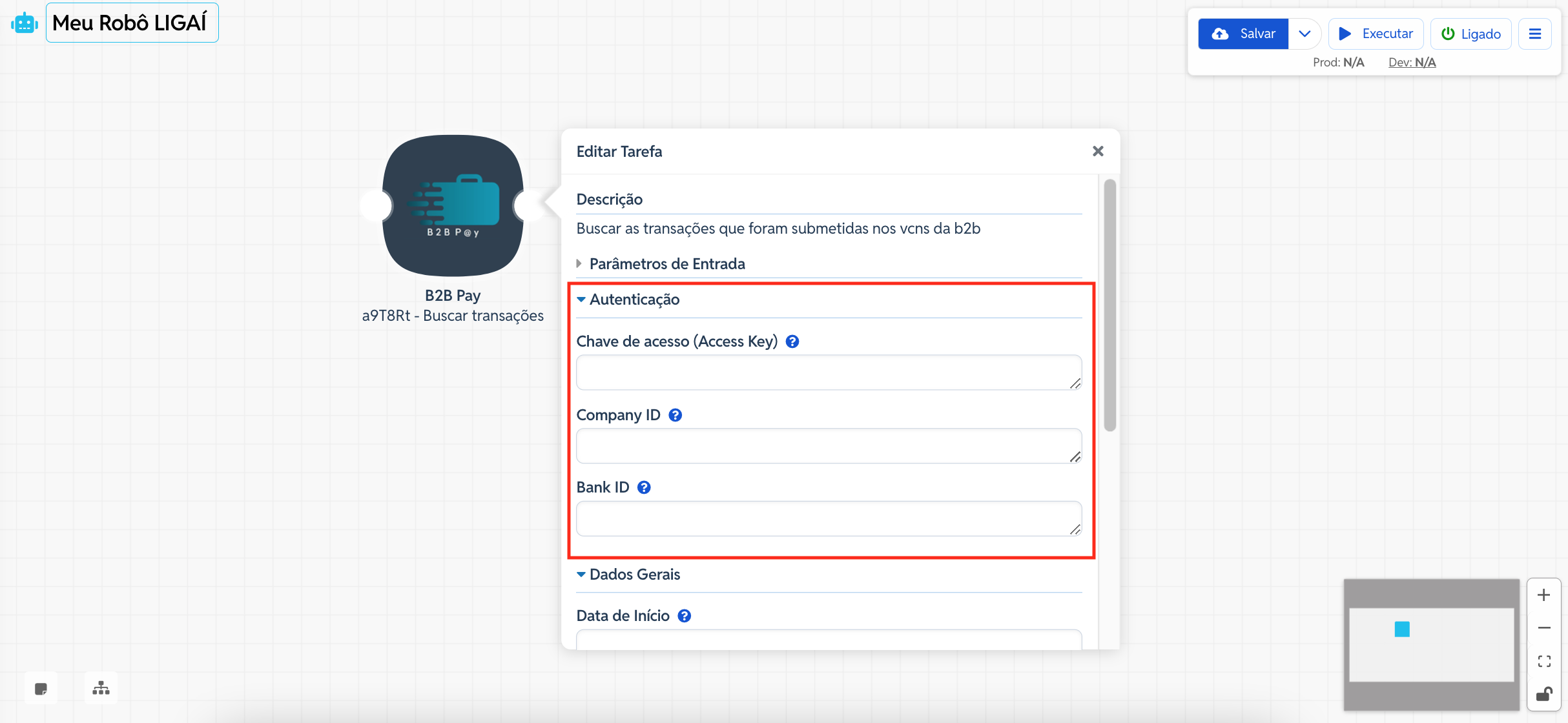 Antes de configurar a etapa no robô, é necessário possuir as credenciais de acesso à API da B2B Pay (Access Key, Company ID e Bank ID). Sem esses dados, o robô não conseguirá autenticar para realizar a busca.