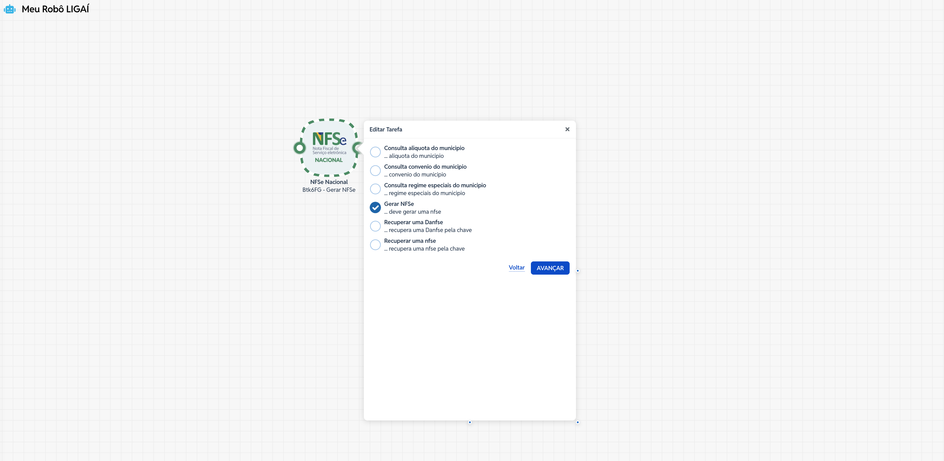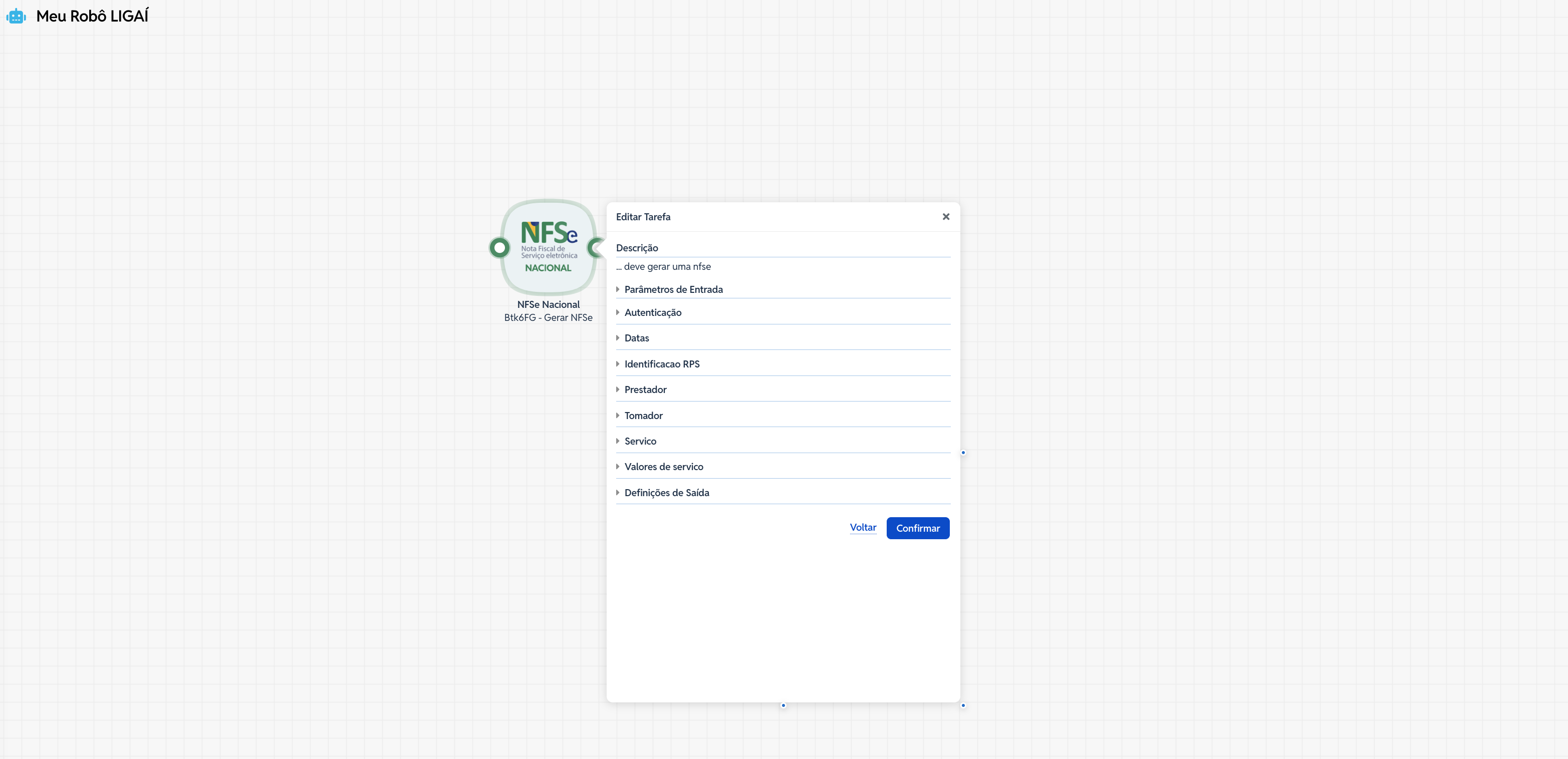 Este artigo explica como configurar o conector NFSe Nacional, na ação Gerar NFSe, dentro de um robô no LIGAí. Esta ação permite a emissão de Notas Fiscais de Serviço Eletrônicas seguindo o padrão nacional unificado. A configuração deve seguir estritamente as seções detalhadas abaixo para garantir a validação do documento.