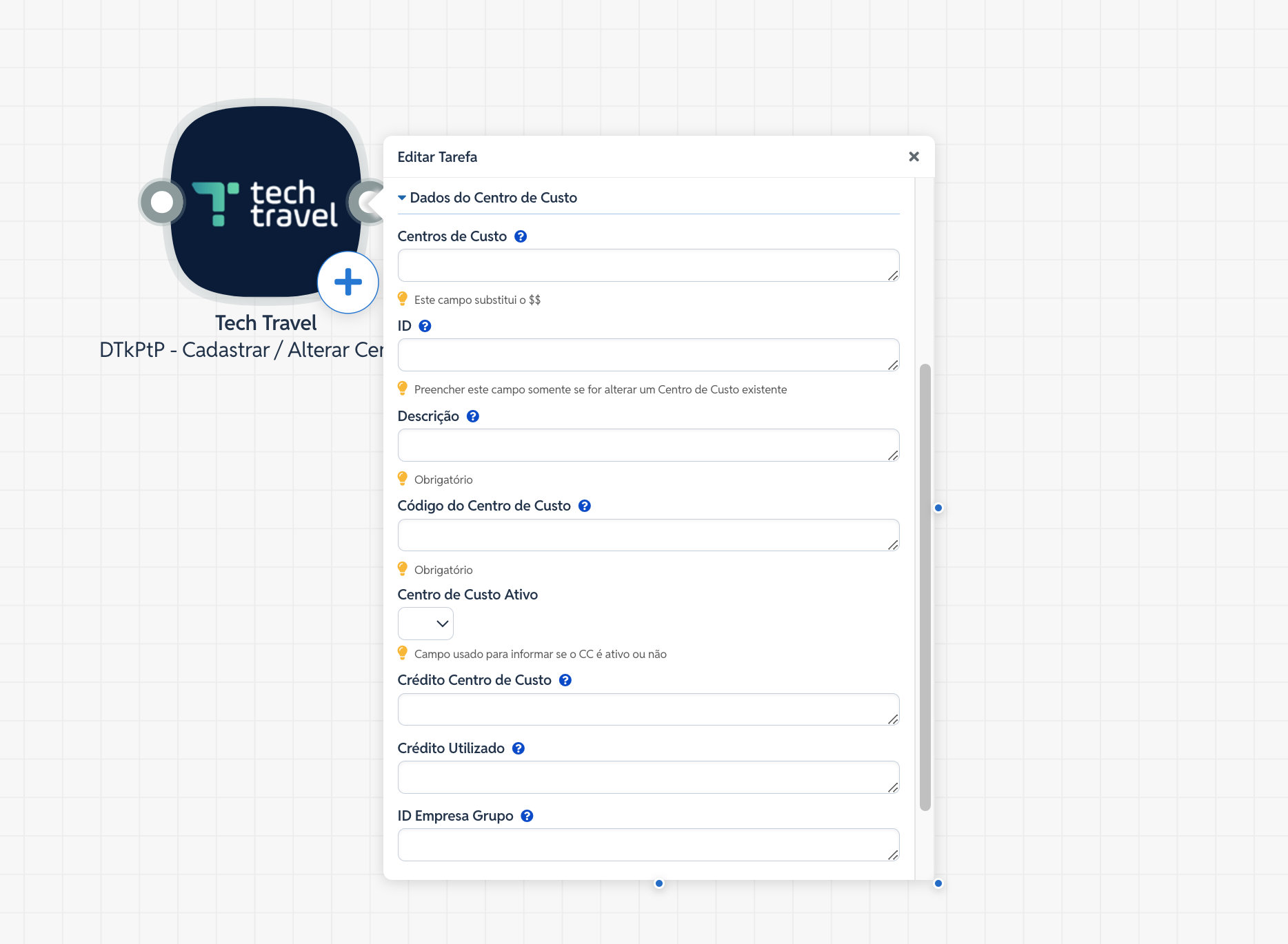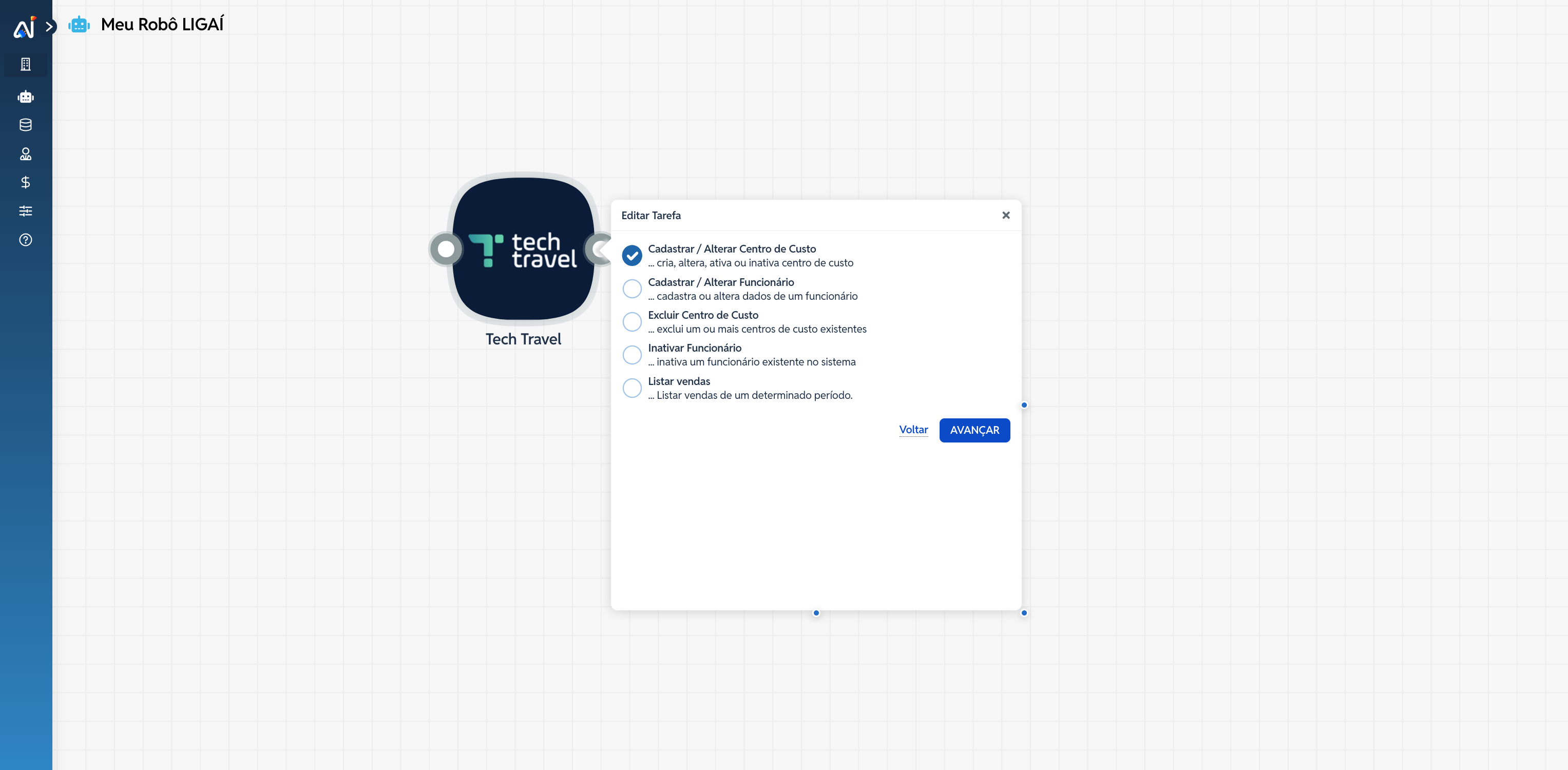 Este artigo explica como configurar o conector TechTravel, na ação Cadastrar/Alterar Centro de Custo, dentro de um robô no Ligaí. Esta ação permite que o robô gerencie de forma automatizada a estrutura de custos da plataforma, criando novos registros ou atualizando dados de centros de custo já existentes.
