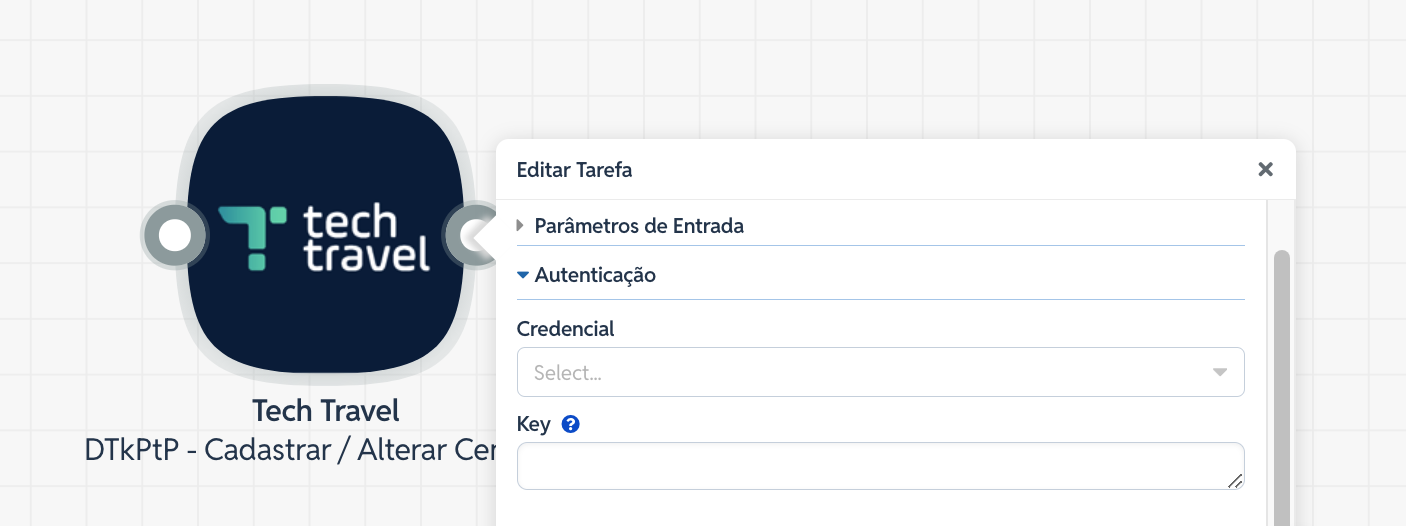 Chave (Key): Insira a credencial (token) fornecida pela TechTravel para autenticar as requisições do robô.