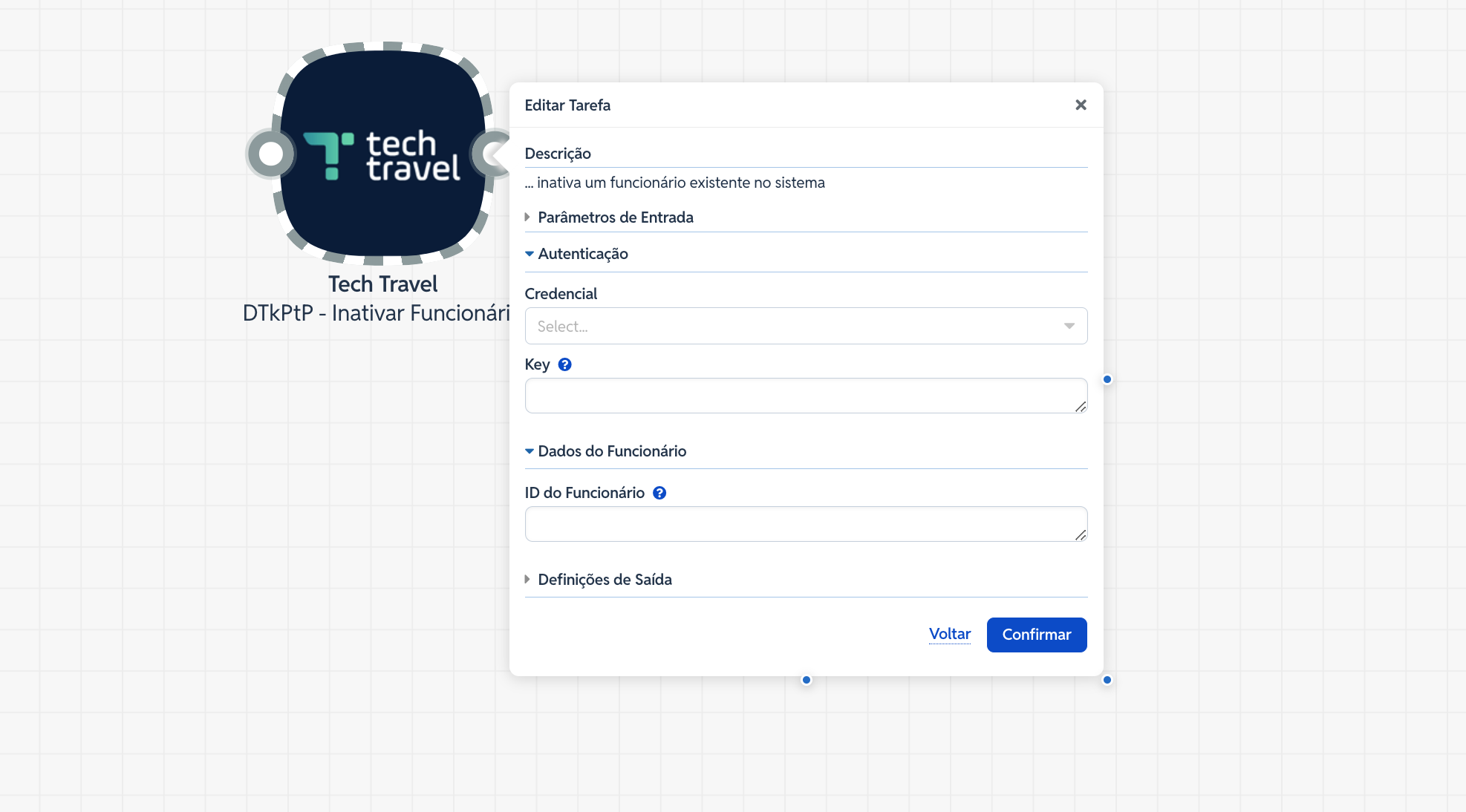ID do Funcionário: Insira o identificador único do colaborador no sistema TechTravel. Este campo é fundamental para que o robô localize o registro correto.