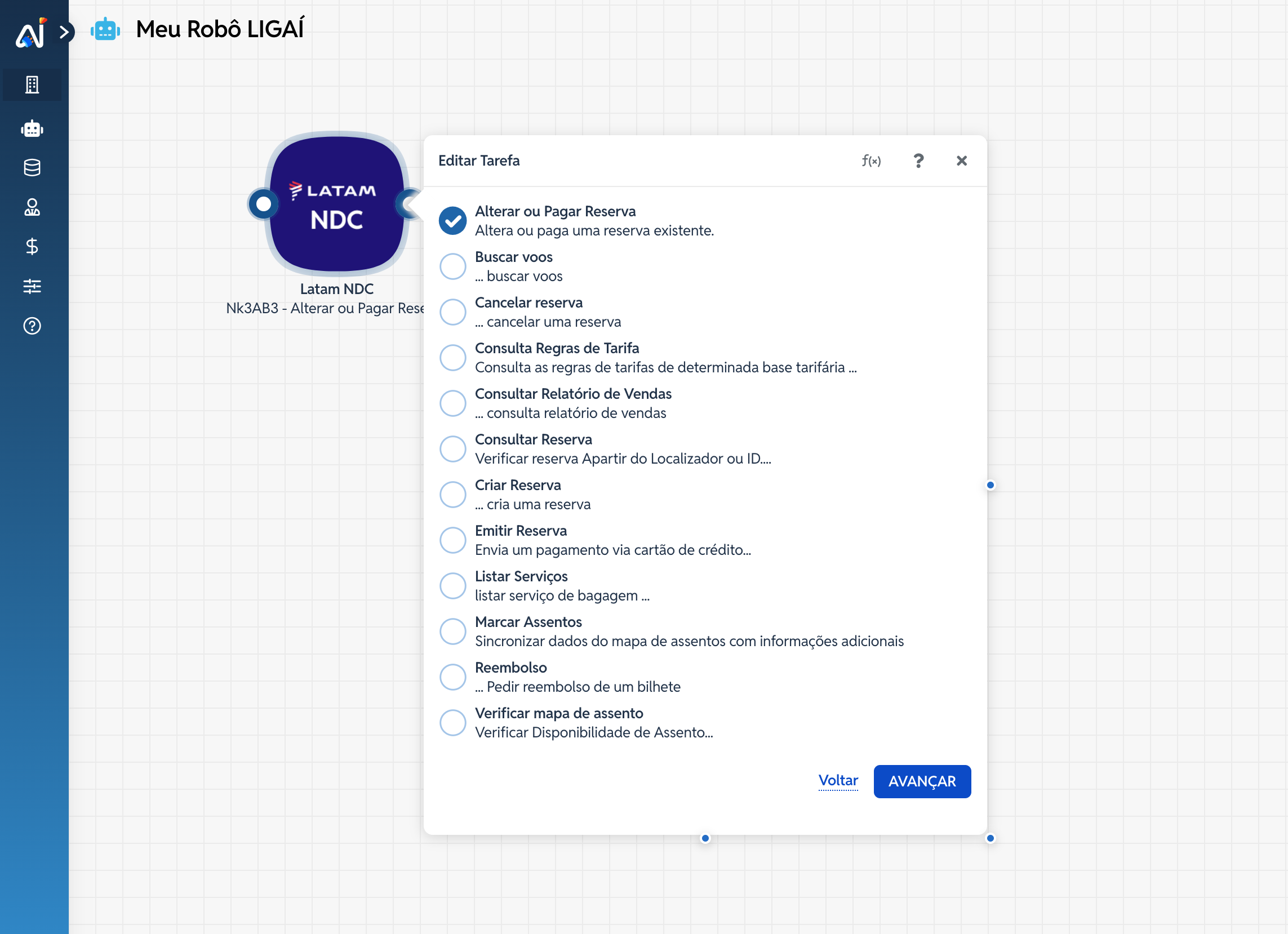 Este artigo explica como configurar o conector Latam NDC, na ação Alterar ou Pagar Reserva, dentro de um robô no Ligaí. Essa ação permite realizar a alteração de uma reserva existente ou efetuar o pagamento de uma oferta selecionada diretamente pela Latam, utilizando o fluxo NDC. Essa ação é utilizada após a seleção de uma oferta e possibilita confirmar a alteração da reserva, com ou sem pagamento imediato.